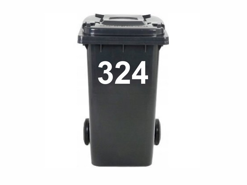 Samolepka na popelnici, číslo. Standardně výška písma 10 cm. Možnost úpravy, barvy, fontu, textu, napište do poznámky. Vyrobeno z kvalitní samolepící pvc fólie s dlouhou životností. Vyřezávaná samolepka. Dodáváno na podkladovém papíru s nanášecí fólií (samolepka bez pozadí).