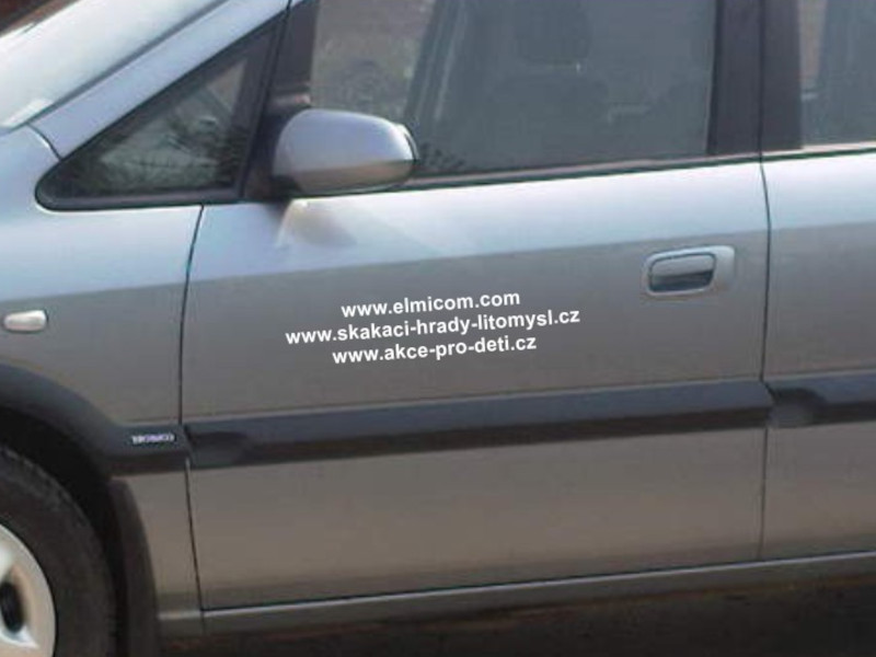 Polep samolepka kontakt na boční dveře auta. Zakázková řezaná samolepka. Barvu vyberte v možnostech, obsah napište do poznámky. Termín dodání cca 3-4 pracovní dny. Kvalitní pvc samolepka pro interiéry i exteriéry. Možnost aplikace na plechy a rovné povrchy (dveře auta, skla, atd). Standardní šíře cca 45 cm.
